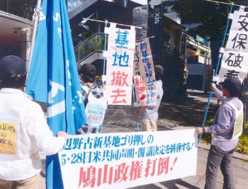 | 那覇・名護で労・学・市民が決起 5・28 アメリカ・オバマ政権とこれに屈服した鳩山政権は、ついに五月二十八日、「普天間基地」の「辺野古」への移設を明記するのみならず、米軍の訓練の日本全土への拡大をも謳った日米共同声明を発表した。沖縄の労働者・学生・市民は、鳩山政権のこの許しがたい所業への満腔の怒りに燃えて、「日米共同声明弾劾! 辺野古海兵隊新基地建設阻止! 普天間基地即時撤去!」の闘いに決起した。 |
