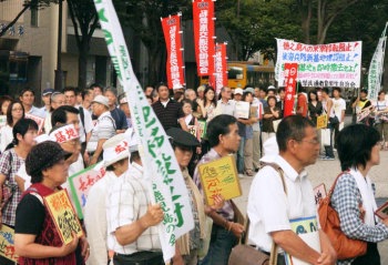 | 八月八日、鹿児島市において、鹿児島県本土に在住する奄美出身の労働者・市民は、「八・八徳之島への基地移設反対鹿児島集会&ピースウォーキング」と銘打って、在沖米軍の徳之島への移転に反対する集会を鹿児島市役所前のみなと大通り公園で開催し、市街地デモを敢行した(「基地反対! 徳之島に連帯する鹿児島の会」主催)。 たたかう鹿大生たちは、彼らの呼びかけに応えて「鹿児島集会&ピースウォーキング」に参加し、徳之島・奄美の人民と連帯してたたかい、この日の闘いに戦闘的息吹を吹きこんだ。 |
