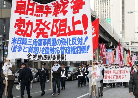 日本経団連を総本山≠ニする独占資本家どもは、春闘を前にして「賃上げなどは問題外!」という居丈高な態度をとっている。アジアなどの経済新興諸国市場において、欧・米のみならず中国や韓国の諸企業との激烈な市場争奪戦に勝ちぬくべく、「コスト削減」をいっそう徹底するために賃金上昇をいっさい認めないという方針を傲然とうちだしている。 この独占資本家どもの要求に応えて菅民主党政権は、年明けの内閣改造をもテコとして、いよいよ消費税大増税とTPPという名の環太平洋自由貿易圏への日本の参加を強行する意志を剥きだしにしている。膨大な国家財政赤字の増大をも厭わずに法人税減税などの独占体支援策を相次いで強行し、それによって生じる税収不足を、労働者・勤労人民からの収奪の一挙的強化によって賄おうと策しているのが、今や「国民の生活が第一」というベールを完全にかなぐり捨てたこの政権なのだ。 しかも菅政権は、アメリカ帝国主義のオバマ政権に付き従い、北朝鮮や中国の「脅威」を煽りたてながら、中国を主敵≠ノ据えて日・米・韓三角軍事同盟の強化に狂奔している。オバマ政権が金正日の北朝鮮を「体制崩壊」に追いこむことを狙ってしかけている軍事的挑発と経済制裁に積極的に協力し、もってヤンキー帝国主義の戦争放火に加担しているのだ。 まさに二〇一一年の劈頭(へきとう)において、日本の労働者・勤労人民は、菅政権と独占資本家階級の攻撃によって新たな戦争と貧困を強制されようとしている。だが、「連合」古賀指導部は、早ばやと賃上げ要求を放棄し、傘下労組の反戦闘争への取り組み・決起を抑圧している。「全労連」の日共系指導部もまた、「内需拡大による持続可能な日本経済」の実現をひたすら独占資本家どもと菅政権にお願いしているにすぎない。 すべての諸君! わが同盟と革命的・戦闘的労働者たちの責務は重かつ大である。いまこそわれわれは、「日本経済の復元」なるものを政府・独占ブルジョアジーに求める「連合」指導部の「救国」春闘を突き破り、新たな<戦争と貧困>の強制を打ち砕く労働者階級の一大反撃を組織するのでなければならない。「大幅一律賃上げ獲得!」「消費税大増税阻止!」「朝鮮戦争勃発阻止!」を焦眉の課題とする<反戦・春闘>の高揚を切り開け! すべてのたたかう労働者は、二月六日に開催される「二〇一一年春闘勝利――労働者怒りの総決起集会」に全国・全戦線から結集せよ! 以下、見出し 一、独占ブルジョアジーと菅政権による新たな貧困と戦争の強制 A「海外移転」のための大量解雇・賃下げ攻撃 B大増税と日米新軍事同盟強化に突進する菅政権 C「日本経済の成長」をこいねがう既成指導部による春闘の歪曲 二、「救国」産報運動を突き破り二〇一一春闘の戦闘的爆発を! A「連合」指導部の「賃金水準復元・格差是正」要求の欺瞞を暴きだせ B今こそ<反戦・春闘>の爆発を! |