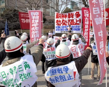 首相・菅は一月二十日に「外交演説」なるものをおこない、「日米同盟は日本外交の基軸であり、政権交代にかかわらず維持・強化されるべき」などとほざいた。まさにそれは対米追従≠フあからさまな宣言ではないか。中国敵視≠鮮明にしての日米新軍事同盟強化という<戦争>への道≠ひたすらつきすすんでいるのが菅政権なのだ。それだけではない。菅政権は、独占諸資本を支援するための法人税減税やTPP(環太平洋戦略的経済連携協定にもとづく自由貿易圏)への日本の参加へ突進している。そして法人税減税による税収減の穴うめのために、今通常国会において「社会保障と税制との一体改革」の名のもとに消費税大増税・社会保障制度の改悪にむけての道筋をつけることを画策しているのだ。 まさしく、<戦争と貧困>を労働者・人民に強制する反動の牙をむきだしにしているのが菅政権なのだ。この菅政権による法人税減税・消費税増税を、「連合」の古賀指導部は積極的に支持している。日本共産党の不破=志位指導部にしても、菅政権がオバマ政権とともに日米新軍事同盟の対中・対露攻守同盟としての現実的強化に拍車をかけているこのときに、そしてまた中・露両権力者が対米対抗の核軍事力増強に突進しているこのときに、「(アジア・世界では)平和の流れが滔々(とうとう)と広がっている」などと平和ボケ丸だしの妄夢にまどろみ、日・米・韓の合同軍事演習(および中・露の対抗的軍事演習)に反対する平和運動の組織化を放棄している。 こうした既成指導部の底なしの腐敗・堕落のゆえに、菅政権が労働者・人民に貧窮化を強制するばかりか、朝鮮戦争切迫の危機のもとで米・韓の戦争放火者の陣に馳せ参じようとすることさえもが許されつづけているのだ。 全学連のたたかう学生たちはこの現実への心底からの怒りに燃え、これをなんとしても突き破らんと決起した。二〇一一春闘の高揚のためにいま職場深部で不屈にたたかっている革命的・戦闘的労働者と連帯し、首都中枢において<戦争と貧困>を強制する極反動菅政権打倒!≠フ火柱を燃えあがらせたのだ。 以下、見出し 朝鮮戦争勃発阻止! 意気高く戦闘的デモ 怒りほとばしる総決起集会 反戦・政治経済闘争の爆発をかちとり菅極反動政権打倒へ驀進せよ 朝鮮戦争勃発阻止! 日米新軍事同盟の強化反対! 消費税増税を許すな! |