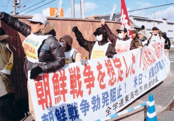 全学連東海地方共闘会議のたたかう学生たちは、一月十九日に、政府・防衛省が「邦人救出」を名目にして朝鮮半島有事に備えての軍事演習を強行していることにたいして、唯一、小牧基地現地において怒りの抗議行動に決起した。 |