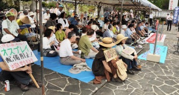 宜野湾市などの主催でおこなわれた「オスプレイ配備反対!」の労働者・住民の座り込みの闘い。たたかう学生たちも連帯して参加 (6月13日、宜野湾市役所前) |