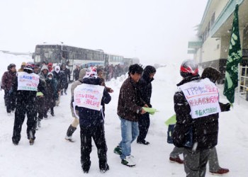 | 「TPP交渉参加を阻止しましょう!」「農畜産業を壊滅に追いやるTPP参加を阻止しましょう!」「日米安保同盟の強化につきすすむ安倍政権を弾劾しましょう!」たたかう学生たちが、寒さも吹き飛ばす元気な声をかけながらビラを手渡すと、「吹雪の中、ご苦労さん」と参加者たちも呼応して手を出してビラを受け取っていく。 | |