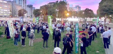 九月十日、札幌市大通公園西三丁目で、「日米共同訓練ならびに米軍輸送機オスプレイ飛来に反対する抗議集会」(主催・北海道平和運動フォーラム)が開催された。 日米両権力者は九月十一日から、北海道・岩国・九州・沖縄・硫黄島などの演習場や基地などで日米共同演習「レゾリュート・ドラゴン25」を開始しようとしていた(九月二十五日まで)。米軍から約五〇〇〇人、陸海空自衛隊から約一万四〇〇〇人を投入した過去最大級のこの共同演習は、米海兵隊の「遠征前進基地作戦(EABO)」構想にのっとって日米統合の対中国戦争遂行体制を強化するものにほかならない。 北海道では、道内の演習場(北海道大演習場・矢臼別演習場・計根別(けねべつ)着陸場など)を第一列島線上の離島にみたてた日米両軍が、ここに沖縄駐留米軍のオスプレイやハイマースの部隊、陸自西部方面隊の「12式地対艦ミサイル」部隊などを緊急展開させ、六月に静内射撃場で「88式地対艦ミサイル」の実射訓練を強行した陸自北部方面隊の部隊などと統合部隊を編成して実弾射撃訓練をふくむ大演習を開始しようとしていた。 習近平政権がプーチン、金正恩とともに、「抗日戦勝記念」軍事パレード(九月三日)で中国軍核部隊を閲兵≠オた直後に開始されたこの対中国戦闘演習は、東アジアにおける戦争勃発の危機を高めるものいがいのなにものでもない。 このような緊迫した情勢のなか、「レゾリュート・ドラゴン25」演習への怒りに燃える北教組、札幌市職労、全港湾などの組合員、民間労働者・市民など二〇〇名が、全道各地から夕暮れせまる大通公園に続々と結集してきた。 |