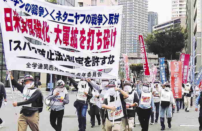 | 十月十九日、反戦青年委員会と全学連関西共闘会議の労働者・学生は、高市の自民党が維新の会とともに極反動政権を樹立させようとしていることへの怒りに燃え、全関西労学統一行動に勇躍決起した。 | |