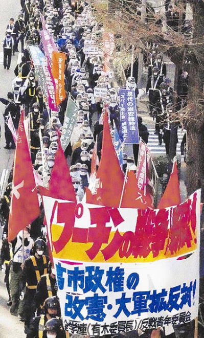いま、侵略者プーチンは、ウクライナ全土のエネルギー施設を徹底的に破壊し、ウクライナの人々を酷寒と飢えと暗闇に叩きこむ連日連夜の猛爆撃に狂奔している。そして前線では占領地拡大のための突撃作戦に狂奔し、占領した東南部四州では六〇〇万人のウクライナ人民に拷問・虐殺とロシア化を強制している。 アメリカ大統領トランプがウクライナにたいして、ロシアの要求をほぼ丸のみにした「和平案」の六月までの受け入れを迫るなかで、プーチンは嵩にかかってウクライナへの攻撃を強めているのだ。 この蛮行を断じて許すな! 労学はプーチン政権の出先機関たるロシア大使館に猛然と怒りの拳を叩きこんだ。 レジスタンスを不屈に闘いぬくウクライナ人民、その先頭で「オリガルヒも占領者もいないウクライナ」の実現めざして奮闘するウクライナ左翼――彼らと固く連帯してわが労学は総決起した。労学は、ウクライナ反戦闘争から逃亡を決めこむ日共・志位=田村指導部を弾劾しつつ、ウクライナ反戦デモに起ちあがった全世界人民と連帯して、日本の首都中枢に「<プーチンの戦争>粉砕」の烽火を高だかと噴きあげたのだ。 それとともにわが労学は、首相・高市が先の衆院選で三分の二議席を制圧した国会の場で、「重要な政策転換」の名のもとに大軍拡や憲法改悪への「挑戦」を呼号する施政方針演説をおこなったその直後に、国会・首相官邸を「大軍拡・憲法改悪阻止!」「労働者人民への貧窮の強制反対!」の怒りのデモで包囲した。もってわが労学は、総選挙の敗北に腰砕けとなる日共中央の闘争放棄をのりこえるかたちで、労働者人民に反動の牙をむき突進を開始した第二次高市政権にたいして、断固たる反撃の巨弾を叩きこんだのだ。 白ヘル部隊が戦闘的デモ 午後二時半、全学連と反戦青年委員会の白ヘル部隊は、芝公園二十三号地からデモ行進にうってでた。 デモの先頭には「<プーチンの戦争>粉砕! 高市政権の改憲・大軍拡反対!」と大書された横断幕、さらに全学連・反戦・革マル派の真紅の旗がひるがえる。手に手に大学旗・反戦旗や「プーチンのFSB強権支配体制を打ち倒せ!」「長射程ミサイルの配備阻止!」などと書かれたのぼり旗を掲げた白ヘル部隊。彼らが一路めざすのはロシア大使館だ。「侵略粉砕!」「プーチン倒せ!」かけ声をあげながら、力強い足どりで進撃する。 デモ隊が神谷町交差点にさしかかると司会の学生が怒りに燃えて呼びかけた。「デモ隊の諸君! われわれの左手にロシア大使館がある。ウクライナ侵略に狂奔するスターリンの末裔どもにたいして満腔の怒りを叩きつけよ!」 労学はロシア大使館に満身の怒りをこめてシュプレヒコールの嵐を叩きつけた。 「ロシアのウクライナ侵略粉砕!」「ウクライナ全土空爆弾劾!」「ロシア人民は反戦闘争に起ちあがれ!」「FSB強権体制打倒へ前進しよう!」「ウクライナ人民と連帯してたたかうぞ!」 シュプレヒコールの大音響が轟きわたる。 桜田通りを虎ノ門三丁目まで進むと、デモ隊の左手がアメリカ大使館だ。労学は、ベネズエラ軍事攻撃につづきイランへの戦争準備に突進し、高市政権に対中国の最前線に立て≠ニ迫るトランプ政権への怒りを炸裂させた。 「プーチンと結託するトランプ弾劾!」「イラン軍事攻撃反対!」「ベネズエラ軍事攻撃弾劾!」「辺野古新基地建設阻止!」「日米軍事同盟の強化反対!」 さらに進撃を続けるデモ隊。霞が関二丁目交差点にさしかかり、国会議事堂がデモ隊の眼前に姿をあらわしたそのときだ。司会の学生がひときわ力をこめて大音声を発した。「議会を制圧し極反動攻撃を人民の頭上に振りおろそうとしている高市政権にたいして怒りの巨弾を叩きつけよ!」労学はただちにシュプレヒコールをあげる。 「高市政権の大軍拡粉砕!」「憲法改悪阻止!」「安保破棄めざしてたたかうぞ!」「スパイ防止法制定阻止!」「労働時間規制撤廃を許さないぞ!」「高市政権を打倒するぞ!」 こうして国会・首相官邸にたいして波状的にシュプレヒコールを浴びせかけた労学のデモ隊は、日比谷公園までのデモ行進を終始戦闘的に貫徹したのだ。 米―中・露激突下の大戦勃発の危機を突き破れ! ――総決起集会