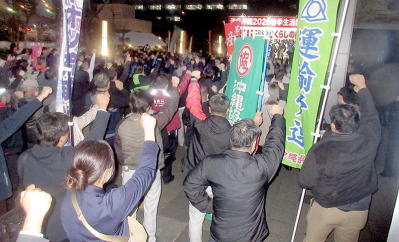 26春闘にむけて「団結がんばろう!」労組員が拳をつきあげる (2月19日、那覇市県民広場) |