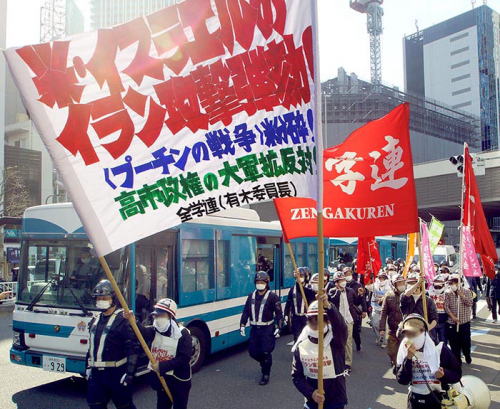「イラン軍事攻撃弾劾!」 全学連 米大使館に戦闘的デモ 首都圏の全学連のたたかう学生は三月九日、「米・イスラエルのイラン軍事攻撃弾劾」の緊急デモンストレーションに断固として決起し、アメリカ大使館にたいして怒りの拳を叩きつけた。 トランプのアメリカがイスラエルとともに――まさに騙し討ち的に――強行したこの先制軍事攻撃こそは、没落軍国主義帝国の野蛮をむき出しにした暴虐いがいのなにものでもないではないか。断じて許すな! イラン軍事攻撃弾劾! さし迫る第三次世界大戦の危機を突き破れ! 全学連のたたかう学生は、怒りに燃えて決起したのだ。