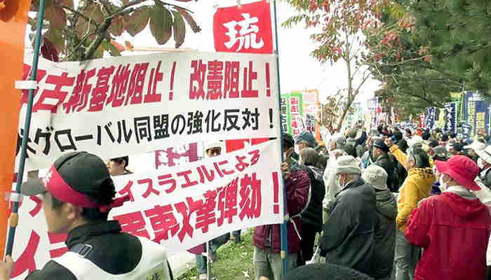 三月七日、名護市辺野古のキャンプシュワブ・ゲート前にて「辺野古大行動」(主催:オール沖縄会議)が開催された。琉球大・沖縄国際大のたたかう学生たちは、県内各地から結集した約六〇〇名の労働者・市民とともに、その最先頭で<反安保>の旗高く奮闘した。この前日の夜、許しがたいことに米軍ヘリUH1が名護市内の住宅地にあるグラウンドに不時着するという事故が引き起こされた。野球練習中の小学生たちを蹴散らしての不時着は、子供や住民たちを恐怖にたたきこんだのだ。この不時着事故を断じて許してはならない! 闘う学生の「イラン攻撃弾劾!」の訴えに共感の渦 午前十時すぎ、「辺野古基地が完成しても普天間基地は返さない」というアメリカ・トランプ政権、そして米・イスラエルによるイラン軍事攻撃に怒りをつのらせ、労働者・人民が続々とゲート前に結集してくる。わが同盟の情宣隊は「アメリカ・イスラエルによるイラン軍事攻撃弾劾!」の大見出しが躍るビラを元気よく参加者に配布する。ビラを受けとった労働者たちがあちらこちらで熱心に読みふけっている。「トランプはどうにかしないといけない!」と情宣隊に表明し、イラン攻撃に狂奔するトランプ政権への怒りを表明してくる市民もいる。本集会の前に発言した市民は、熊本・陸自健軍基地への長射程ミサイル配備に反対する人々と連帯しようと訴えた。 |