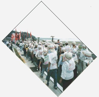 | 沖縄サミット粉砕の大横断幕を先導に 58号線を部瀬名岬にむけて堂々と行進 |