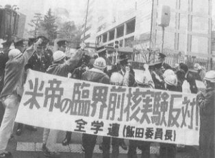 Her voice against the constitutional revision reverberated the hall.- LDP MPs could only defend their position with a cheap logic: 'If Japan should meet an attack, how to do?' - 'Really needed is to make an opposition movement against military build-ups by the governments in solidarity with the people across the world'. - Controversies heated up also over the coercive 'Wiretapping Law' among MPs and invited students including the gallery with the impetus of her challenging intervention. No to subcritical nuclear tests! Zengakuren waged a protest at the gate of the US Embassy in Tokyo (7 April) (Photo section 4-5) [3] Smash a new 'Democratization League [Mindo]'! Full quotation from the relevant doccuments. - View of the General Federation of Japan Railway Trade Unions on a new 'Democratization League' - The concerned Joint Statement for 'Democratizing' East Japan Railway issued by three trade unions (JR Trade Union Confederation-East Japan Railway Industry Trade Union, JR Trade Union Confederation-JR Green Union, National Railway Workers Union-East Japan Chapter). [4-5] For the coming joint action of workers and students on 29 April Smash the Constitutional revision by the Mori administration! Smash building of a war readiness order for aggression! Denounce the official leadership of SDPJ / JCP immersed in election campaigns! Fight back by transcending their parliamentarianist distortion!