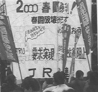 [5] The extraordinary convention of the National Railway Workers Union Battles but premeditated - The NRU leadership has completely yielded to the government. [6] Children are also mobilized to the official campaign for welcoming the Okinawa Summit [7] The general meeting of stockholders of the Central Japan Railway Co. held under an unusual security order. - On the eve of the meeting a sabotage on train operation occurred: Never allow them to take a conspiracy for frame-up! [8] Smash the Kyushu-Okinawa Summit (continued from p.1.) |