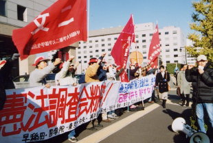 7 Nov. at the SDF Tsuiki base in Fukuoka: militant students and workers protest against the evacuation drill (Photo right bottom) 6 Nov. in Sasebo City, a military centre: militant students demonstrate together with workers from the Sasebo District Federation of Trade Unions against the local US and SDF bases 2 Nov. at the SDF Aibano training field in Kansai: militant students fight to stop the 'anti-guerrilla' drill 2-11 Nov. in Okinawa: Zengakuren - Okinawa Prefectural Federation wage a series of fights against US Marines joining the drill [3] 22 Oct. in Osaka: workers and students rally against the Security Treaty 7 Oct. at Osaka University of Economics: student across the region hold a joint meeting against the military drill at the Aibano training field 26 Oct. in Osaka: militant students join a peace rally sponsored by trade unions 20 Oct. in Kanazawa, Mori's constituency: students demonstrate against the Constitutional revision, handing their statement of denunciation to the local LDP office [4] Remnants of the ruinous Chukaku-ha: covering up and falsifying the reactionary history of their 'war against the JRCL-RMF' [5] Miserable Chukakuha chanting 'Down with the railway workers' federation!' [6] Labour Front Topics: Rengo's '21st Century Vision' proposes a 'Japanese-type of workers' representative system' in corporate governance, declaring a self-destruction of trade unions A municipal-governments' version of restructuring named 'breakthroughs of financial difficulties' Never allow the authorities to victimize workers and people! 1. Stormy offensives for cuts in wages and jobs 2. Reorganization of administrative systems in prefectures and municipalities in accordance to that of the central government 3. What has caused the financial difficulties? [7] Kaleidoscope 2000 - The quagmire in the end of the century: International Surveyors needed for the US - The man reported again by the US intelligence in the explosion of the US destroyer: a proof of the conspiracy - Chen Sui-bian shocked the Japanese nuclear industry - China to restore the Flying Lake: disregarding the 'tragedy of the Aral' [8] JCP history of bankruptcies and confusions No. 3 1970s: Smuggling in the Euro-communism to finish the JCP version of the 'structural reformist' line 1. The 'Declaration of Freedom and Democracy' and its awkward reinterpretation today - From the view of 'four-step transition' to the absolutization of 'immediate reform' - Substantive changes in 'economic democracy' - 'Development' of 'three freedoms'? 2. A gap between the JCP version of 'structural reformist' line and its revised capitalism of today |