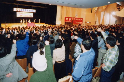 30 Nov. in Tokyo: militant students protest in front of the Diet Building against Ishihara and Sakurai, advocators for revising the Constitution. (The ultra-nationalist Tokyo Governor and the rightist journalist were invited by the House of Representatives Research Commission on the Constitution to make an anti-Constitution agitation.) 23 Nov. in Hokkaido: a trade-union-based Peace Movement Forum holds a regional meeting with 1200 participants over the planned nuclear facility in the northernmost area (Photo right above) - Militant students propagandize to halt the plan in solidarity with fighting workers and residents - Leaders of Rengo and the Democratic Party criticized for their effective acceptance of the nuke facility 26 Nov. in east Hokkaido: Local students protest against the SDF live shooting drill [3] From Students' Cultural Festivals 11-12 Nov. at the University of Ryukyus in Okinawa: many social-critical events held in success 28 Nov. at Waseda University: a diehard JCP scholar on the Constitution beaten at a symposium by students criticizing the party's 'practical use' position to the SDF 25 Nov. at the University of Tokyo: Democratic Party head Hatoyama heckled at a lecture meeting by students criticizing his Constitutional revisionist stand [4] The 22nd JCP Congress: manifesto of a party of 'anti-revolution' 1. Changeover to an 'assistant party of Japan' - Debut of the Fuwa-Shii-Ichida system - Bureaucratic oppression on erupted opposition, deliberately branding them as 'anti-party elements influenced by the JRCL' - The shameless 'soft and hard line' 2. Deception, self-justification, and intimidation - 'Counterarguments' against criticisms of the 'practical use' stance to the SDF - Sophistries for justifying the new definition a 'party of the people [or the nation]' Now is the time to defeat and dissolve the JCP [5] Political dynamics of the 'reconciliation' between the US and North Korea New frictions between the US and China-Russia over the Korean 'settlement' 1. A makeshift by imperialist America pressed by its failure in the world domination - 'The world strongest economy' waning 2. Kim Jong Il's 'strategic change' supported by China and Russia - Rulers of China and Russia busy forming an anti-American net 3. Critical situations aggravated under the ;new cold war' [6] Burn the flame of the JR labour movement! - A workers' discussion meeting held [7] JRCL's declaration of fight [8] JCP history of bankruptcies and confusions No. 5 Expose the myth of the 'consistency in the programmatic line'! 'Abandonment of revolution' by introducing the line of 'democratic alternatives' The 1989 About-face as the turning point in its degradation into a 'social reforminst party' (continued from the previous issue) 3. The 20th Congress where the party formulated its line of revised capitalism - Abandonment of the Stalinist outlook of the times - Declaration of the abandonment of 'socialist revolution' - Rejection of the 'class alliance' - Denunciation of the 'denunciation of the Security Treaty' 4. Kneeling down before the 'affluence of capitalism' and rejecting the 'socialist' idea - Changeover to a 'decoloured Stalinism' - Complementation to the neofascist regime Supplement: the JCP after the 1989 about-face 1. 1993: 'Broad cooperation based on the single task in defence of the Constitution' 2. 1995: 'Broad cooperation with non-partisan people' 3. 1996: 'Cooperation with conservative people' 4. 1998: a 'freeze' on the 'denunciation of the Security Treaty' and the suggestion to accept the legalization of the 'Rising Sun' as the national flag and the 'Reign of the Emperor' as the national anthem |