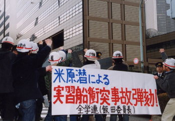 the Ehime Maru!![]() Now is the time to overthrow the incompetent, shameless Mori Cabinet! - A big tragedy caused by a 'show' for promoting mass military build-ups - The Mori cabinet sunk with its failure over the sub collision - Intensifying struggles for power after Mori - Oppositions within the conservative political elite over revision of the Constitution - The official SDPJ / JCP leadership immersed in their policy promotions for the coming election - Oppose the Security Treaty! Advance to overthrow the Mori cabinet! Denounce imperialist US and Britain airstriking Iraq! Never allow the war arsonists! - Zengakuren students wage their protests at the US Embassy (Photo right) [2] No USS port-calls! Zengakuren Hokkaido fights together with militant workers 3 Feb, Hakodate: Stop the US frigate! Zengakuren students fight despite the blizzard before encouraging a local Rengo rally against the port-call together with militant workers 7 Feb, Tomakomai: Militant students fight to block the flagship of the US Seventh Fleet, lead a trade-union-sponsored rally together with militant workers 30 Jan, Obihiro: Students from Obihiro University of Agriculture and Veterinary Medicine protest against a US military jet landing at a civilian airport 10 Feb., Osaka: Zengakuren Kansai protest against the nuclear sub collision at the US Consulate 29 Jan., Nagoya: No KSD bribery scam! Down with the Mori cabinet! Zengakuren students protest against the LDP Prefectural office Surging protests against a series of crimes by US troops 12-17 Jan., Okinawa: Militant students lead the struggles