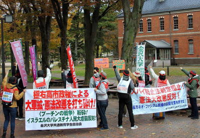 (pic above right) 'Smash Russia's aggression against Ukraine!' White-helmeted militants marching on the Russian embassy, raising their fists with anger [6] Anti-war, anti-fascist demonstrations across the country October 19th The united action by workers and students in Osaka Anger flares up against Osaka-based right-wing Ishin, now part of a ruling coalition