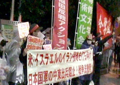 | Shatter US imperialist and Israeli armed aggression against Iran! Prevent the dispatch of the Japanese military! Prevent Japan's participation in the war! Nullify the security-related laws! Create a surge of Iran antiwar, anti-Ampo and anti-Takaichi government struggles! ![]() (pic) 'Shatter the aggression against Iran! No to Japan's dispatch of troops!' Zengakuren students from all over the country marching to the PM's Office and the US Embassy, March 19th - Pulverize military neocolonialism aimed to exterminate Iran! - Prevent Japan's participation in the war by sending its troops to the Strait of Hormuz! - Let us break through the danger of the outbreak of a third world war in solidarity with people all over the world! 'No to the US and Israeli military attacks on Iran!' Zengakuren stood firm in the forefront of the protest March 19 Emergency Action in front of the Diet Building