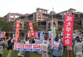 政府・名護市当局による辺野古新基地「V字滑走路案」の合意弾劾 知事尻押し運動をのりこえて闘おう! すべての労働者・市民・学生のみなさん! 三月二十一日以降、政府防衛庁との公式協議を積み重ね、政府案受け入れ公表のタイミングをうかがっていた島袋名護市長は、四月七日、額賀防衛庁長官が提示した「V字滑走路・沿岸案」を受け入れた。そして、金武、恩納、宜野座、東の四町村長も島袋につき従い、政府案を受け入れたのだ。 われわれは、政府防衛庁・名護市当局のこの暴挙を満腔の怒りをもって弾劾する。 |