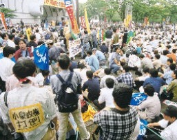 わが同盟は、このような労学の闘いに呼応して、独自にビラまきなどをつうじて、社共既成指導部が有事法反対闘争を院内四野党共闘の尻押し運動に歪曲しようとしていることを声を大にして暴きだし、議会主義的歪曲をのりこえて<有事立法粉砕・小泉政権打倒>の一大闘争をつくりだすべきことを鮮明にさししめしたのである。 すべての労働者・学生諸君! 6・15―16闘争のきりひらいた地平をがっちりと踏みしめ、有事立法粉砕の闘いのさらなる前進をかちとろう! 以下、章見出し 労学市民が怒りの決起 闘う学生の集会・デモに共感広がる 日共中央の議会主義的歪曲に抗して――下からの共同行動の高揚 ブクロ派残党の潜り込み・挑発を許すな |