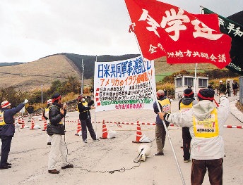 「有事立法粉 砕!」労・学・市民2万5千が決起代々木公園で開催された「STOP! 有事法制 12・1大集会」において、闘う学生たちは、「アメリカのイラク侵略阻止! 反北朝鮮の民族排外主義に抗してたたかおう!」と呼びかけつつ闘いぬいた〔詳報次号〕 「日米共同演習阻止!」日出生台に反戦の声轟く ―11・9〜11、全学連・九共闘が連続闘争 ![]() ![]() 全学連の学生たちは、十一月中旬からの日米共同統合演習に反対する闘いに決起した。大分県の日出生台・十文字原両演習場では、十一月十一日から二十一日までの十一日間、沖縄駐留のアメリカ海兵隊と陸上自衛隊との合同演習が強行されようとしていた。たたかう学生たちは、イラク軍事攻撃にむけたこの演習の強行に反対して、九日と十一日には日出生台・大分港現地闘争に、十日には在福岡アメリカ領事館への抗議闘争に、断固として起ちあがった。写真は、(左)九共闘が演習開始式粉砕に決起(11・11、日出生台演習場第二ゲート前) (中)米軍車輌に抗議の声をあげる労組員と全学連(11・11、大分港大在公共埠頭) (右)九州ブロック総決起集会で労組員と連帯し闘う全学連(11・9、大分県九重町) 神戸大で軍学共同有事研究反対の闘いが前進 11月10日には多くの労働者・学生・市民が参加して集会を開催し た。 |