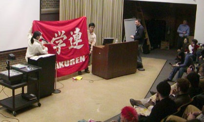 戦争狂(ブッシュ)≠フ足もとを揺るがす 全学連派遣団、全米各地で奮闘 CANの全国会議でスタンディング・オベーション 2・22―23シカゴ 「アメリカ帝国主義のイラク侵略戦争を阻止する闘いを、戦争狂ブッシュの足元から断固として創りだすぞ!」――飯田委員長を先頭とするわが全学連アメリカ現地闘争団は二月二十日、決意も固く成田空港を飛びたった。 最初の目的地はイリノイ州のシカゴ。到着した現地闘争団は、二月二十一日に現地の学生デモにただちに合流。この場において、飯田全学連委員長が発言にたつ。「日本の政府は、米軍を支援するために自衛隊をアラビア海に派遣した。この策動をとめることが私たち日本の学生の責務だと思っている。太平洋を越える連帯の力で、イラクへの侵略戦争を阻止しよう!」と満身の力を込めて呼びかけた。これを号砲にして、アメリカ現地闘争団の闘いは始まったのだ。