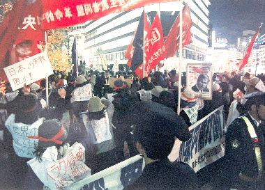 血迷ったブッシュ・ブレアは、ついに二十日に総攻撃を開始した。開戦直後に日本の小泉は「武力行使支持」を表明した。この米英帝国主義のイラク人民皆殺し戦争とこれへの小泉の追随に怒りを覚えた労働者・学生・市民数万が、この三月二十一日、首都東京において起ちあがった。とりわけ、既成ナショナルセンターの枠をこえた労働組合の共同行動として「イラク反戦」の闘いをつくりだそうという意気に燃えて労働者・学生・市民六千余名が、日比谷野音に結集したのである。 日比谷野音の入り口では、首都圏のたたかう学生たちが「イラク攻撃弾劾」の横断幕を掲げマイクで参加者に闘いを呼びかけている。わが同盟も、真紅の「革マル派」旗を掲げてわが同盟の声明ビラを参加者に配布した。社共既成左翼指導部がこの決定的局面において弱よわしく「国連憲章違反の攻撃反対」と言うだけで反戦の闘いの組織化を放棄していることを暴きだし、イラク反戦闘争の国際的高揚をつくりだすべきことを訴えたのだ。 |