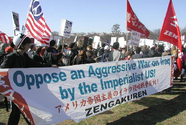 | 今こそ全世界労働者人民の〈反戦〉の嵐で戦争屋どもを包囲し打ち倒せ! ワシントンに全学連旗翻る 「ブッシュを倒せ!」派遣団が奮闘 3・15 わが全学連アメリカ現地闘争団は、ついにヤンキー帝国主義権力者の中枢=ホワイトハウスの眼前で、真紅の全学連旗を翻した! 三月十五日、「インターナショナルANSWER連合」などの呼びかけのもと、「NO WAR ON IRAQ!」を一致点としたホワイトハウス大包囲行動に全米から結集した十万人にのぼるアメリカの労働者・人民が決起した。われわれ闘争団は、彼らと合流し固く団結しつつ、「アメリカ帝国主義のイラク侵略戦争反対!」を掲げて、戦争狂=ブッシュの眼前で革命的反戦闘争の炎を高だかと吹きあげたのだ。