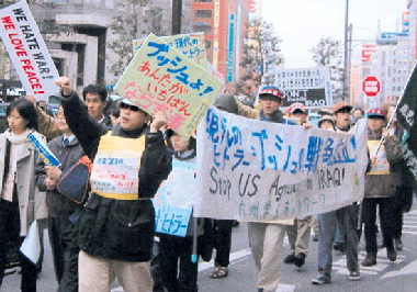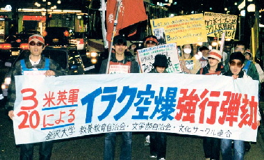 イラク反戦世界同時行動―九州の学生が労働者・市民とともに福岡米領事館にむけてデモ(三月十五日、福岡) |