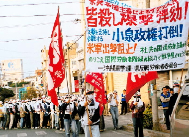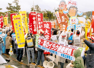 3・30沖縄 米軍石平(いしんだ)司令部ゲート前で開催された「止めようイラク戦争! 緊急集会」において、県学連の学生たちは1000名の労・学・市民の最先頭でたたかいぬいた |