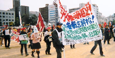 「ブッシュを倒せ! コイズミ倒せ!」大阪の労働者・学生・市民8000名の怒号が響きわたる(三月二十三日、大阪扇町公園) |