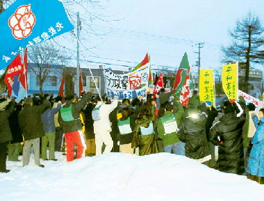 寒気をついて平和運動フォーラムの労働者と帯畜大の学生が怒りのシュプレヒコール(三月二十日、帯広中央公園) |