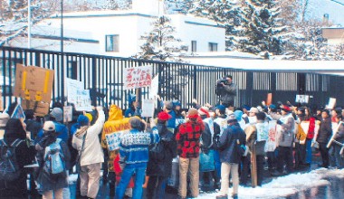 道共闘の学生が市民団体と連帯して奮闘(3月21日、札幌米総領事館前) |