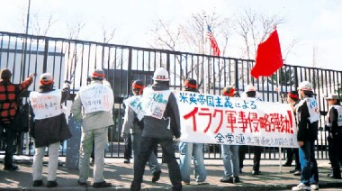 全学連九共闘が「イラク侵略弾劾」の横断幕を高く掲げ断固抗議(3月20日、福岡米総領事館) |
