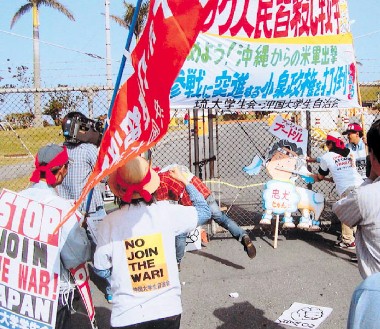 「ブッシュと小泉を打倒するぞ」(3月30日、キャンプ・フォスター第一ゲート前で沖縄県学連が奮闘) |
