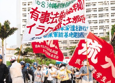 大横断幕を先頭に労学が戦闘的デモ (6月8日、那覇) |