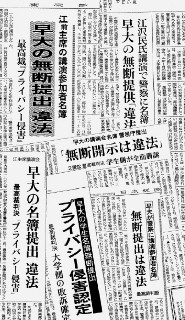 最高裁 早大生らが全面勝訴! 江沢民講演会参加者名簿提供事件訴訟 9・12 九月十二日に最高裁は、早稲田大学が学生らの名簿を無断で警視庁等に提供した事件について、これを「プライバシーの侵害にあたる」と認定し、早大当局にたいして損害賠償を命じる判決を言い渡した。この裁判を四年有余にわたってたたかいぬいてきた早大生たちは、ついに全面勝訴の画期的な判決をかちとったのだ。