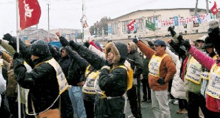 この日朝から千歳に駆けつけた全国の労学三五〇名は、グリーンベルト広場で総決起集会をかちとった後、ただちに航空自衛隊千歳基地ゲートに進撃する。闘志みなぎる労学の部隊は、機動隊の壁を押し返し、自衛隊にたいする抗議文を断固としてたたきつけた。社共既成指導部や民主党・「連合」労働貴族の闘争歪曲を許さず、千歳現地闘争をたたかいぬいたのである。(詳報次号) |