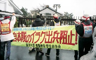 2月3日、金沢大学のたたかう学生たちは、陸自本隊の第一陣が北海道新千歳空港からイラクへ出動しようとしていたまさにそのとき、陸上自衛隊金沢駐屯地にたいする抗議闘争にたちあがった。 |