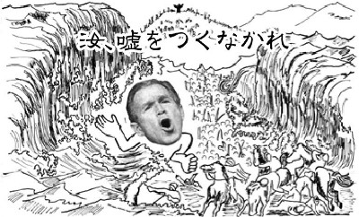 「米国はいつでも、正しいことのために必要なことを進んでおこなってきた。自由の敵、暗殺者の威嚇に決して屈しない。今、米国の言葉を疑うものはいない。」……自由、自由、自由、正義、正義、正義の連呼。神、神、神のくりかえし。 「自由のもとに暮らしたいという願望は、神がすべての人々の心に植えつけられたものだ。だからこそ米国は自由の前進戦略を、中東全域において追求しつづける。米国は、使命を授かった国である。われわれは、われわれに授けられた特別な召命を忘れはしない。すなわち、偉大なるわが合衆国は自由という大義の導き手であるということを。」「わが国は強く、不動である。われわれが奉じている大義は正しい。なぜならば、それは人類の大義であるからだ。自由の勢いは途を誤ろうはずがない。自由はわれわれの力のみによって前進しているのではない。より大きな力〔=神〕が、これまでの歴史の展開を導いてきた。神の目的は正しく、誤りがない。引き続き米国に神の恩寵がありますように。」!! 論理もへったくれもない。単純化とくりかえし、神になぞらえての自己主張、これこそはヒトラーの大衆操作術であったが、ここでもブッシュはまことに今ヒトラーと呼ぶにふさわしい。 神様のおぼしめしと信じて世界の人民を虐殺する狂気(=キリスト教原理主義)に「目覚め」るよりも、能なしのアル中のままでいてくれた方が、どれほど人類のこうむる災厄は少なかっただろう。 キリスト教原理主義を奉じるこの男は、モーゼにまで戻る気はありや?「嘘をつくなかれ」、ご覧のとおり。「殺すなかれ」「犯すなかれ」「盗むなかれ」「人の物を一つたりと欲するなかれ」、過去より途切れなく、目下もイラクでアフガンでパレスチナで世界中で続行中。「いかなる像もつくるなかれ」、ムスリムは守っているが……。 「神の名をみだりに唱えるなかれ」、オオ!「父母を敬え」、パパァー! このひとつだけ。これほどまでにモーゼの戒に忠実≠ナ、なお「神の召命」を口にするブッシュは、「第一の戒・私をおいて神があってはならない」を、ついに自分が神さまだ、とまでひっくり返したのではないか。アメリカ人はこんな「教書」をおとなしく聞いているのか。 「In God, we trust. (我らは神を信じる)」と、この世の神=ドル札に刷りこんでいる国ならではの、倒錯の極みよ。 |