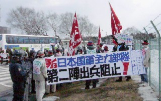 三月十三日、政府・防衛庁は、陸自本隊主力部隊第二陣一九〇名を新千歳空港から政府専用機でイラクへ出動させようとしていた。全学連北海道地方共闘会議のたたかう学生たちは、午前十一時、航空自衛隊千歳基地ゲート前に登場し「日本国軍本隊第二陣出兵阻止!」と書かれた横断幕を広げ、ただちに怒りのシュプレヒコールをあげた。 |
