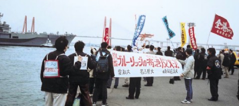 三月十二日、愛知大・名古屋大・岐阜経済大のたたかう学生たちは、同日闘いに起ちあがった港湾労働者と連帯して、米軍第七艦隊旗艦ブルーリッジの名古屋港寄港を阻止する現地闘争に決起した。 |