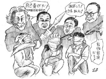 F 何をバカなことを言ってるんだ。まわりの迷惑も考えずに「イラクに残りたい」なんて言うから、ちょっとお説教されただけさ。あまりにも自己責任についての自覚が足りない。おまえも大人になればわかるさ。 D でもね。「自己責任」って、国に迷惑かけたお金を自分で払うことなの? 梅干しをほおばったブルドッグみたいな顔した公明党のおじちゃんが意地悪そうに言ってたけど。それって、ひどくない? F いや。政府が「危険だから行くな」と何度も注意してたんだ。それなのに、あの五人はそれを無視して行った。だから自業自得だな。登山禁止の冬山にそれを無視して登って遭難したみたいなもんだ。そのくせ助けてくれた政府への謝罪も感謝もないから、ちょっと叱られただけさ。莫大な救出費用もかかっているしな。 D でもね。「危険」、「危険」って言うなら、自衛隊はどうなの。「安全だ」といってイラクに行ったはずなのに、まわりに鉄条網や大きなテントを張って。あれって、まるでひきこもりじゃないの。もっとお金がかかっているし。「危険なところに勝手に行ったから自己責任をとれっていうなら、私たちの税金を使った自衛隊の派遣費用を返せ」って、先生が言ってたよ。 F ナニ? 今どきまだそんなロクなことを教えない教師がいるのか。あの連中が通ったバグダッド街道は、自衛隊のいるところと違って、イラクでも一番危険な地域だ。そんなところへわざわざ行って捕まったのは自業自得。いや、ひょっとすると自作自演。…… D でも、お姉ちゃんたちがさらわれたのは、ファルージャというところの近くでしょ。アメリカ軍が村人を何百人も殺して、そのあとも包囲しつづけて皆殺しにしようとしているからで、それを止めさせるためだって、先生から聞いたよ。 F そんなのは関係ない!「自衛隊は撤退せよ」なんて要求は、ファルージャとはいっさい関係ない! 自衛隊は、遠く離れたサマワで人道援助してるんだから。 D でもね。お姉ちゃんたちを救ってくれたイラクのお坊さんも言ってたじゃない。「米軍を支援する自衛隊はイラクから出て行ってくれ」って。イラクの人たちは、自衛隊も米軍の仲間だと思っているよ。ずっと前からイラクでボランティアやってきたお姉ちゃんたちが危険になったのは、イラクの人たちの声も聞かないで、ブッシュさんのいいなりになって自衛隊がおしかけたからじゃないの。お姉ちゃんたちこそ、自衛隊の巻き添えになって、いい迷惑じゃない。 F 何を言うか、バカ! ともかくだな、自分の勝手な都合で人に迷惑をかけたんだから、みんなに謝って、かかった費用も負担するというのが、大人のルールなんだ。 D わかった!「迷惑」、「迷惑」っていうけど、「自衛隊は撤退してくれ」ってイラクの人たちが願っているってことが、あんなに大きく宣伝されちゃったってのが「迷惑」なのね。そういえば、あのお兄ちゃんは劣化ウランっていうのがどんなにひどいかを、カメラマンのおじちゃんはファルージャでどんなにひどい人殺しがやられているかを、日本の人たちに伝えようとしてたって聞いたわ。そんなことやられると、政府はすごく「迷惑」なんだ。「迷惑」って言葉は、大人の世界ではこういうふうに使うんだ!「自己責任」って、政府にこういう「迷惑」をかけた人たちにはお仕置きをして黙らせる、っていう意味なんだ! それでお姉ちゃんたち、日本のお役人が保護したとたんにぐったりしちゃったんだ。これが大人の世界なの!? ワタシ、こんな大人の世界、許さない! F おまえ、いつからそんな生意気な口をきくようになったんだ。日教組が悪いんだな! ともかく、おまえたち子どもには自己責任なんて高級なことはわからないんだ。わかったような口をきくな! D パパ。また髪の毛がライオンみたいに逆立ってきたよ。あ、ライオンていえば、「大量破壊兵器はかならずある」といってアメリカの戦争につき従っている小泉さんの自己責任はどうなるの! 何千人も何万人もの罪のないイラクの人たちの命を奪った戦争の責任を小泉さんはどうやってとるの? パパ、答えて! |