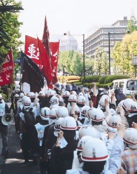 イラクの地においては、ファルージャのスンナ派民衆は――シーア派民衆の支援をも受けつつ――反米・反占領の闘いを人民蜂起へとおしあげ、米軍の暴虐に抗して果敢にたたかいぬいている。ナジャフにおいてはムクタダ・サドル師率いる「マハディ軍」を中心にシーア派の民衆が米軍にたいする武装闘争を展開している。追いつめられた米軍は、ついにファルージャからの撤退を余儀なくされた。ブッシュ政権は、燃えさかるイラク人民の抵抗闘争に直面して完全な軍事的敗北を露わにしただけではない。イラク占領に参加してきた「友邦同盟」諸国が次々と脱落し一挙に政治的孤立化に追いこまれたがゆえに、国連に泣きつかざるをえなくなった。 今こそ、蜂起したイラク民衆と連帯し、アメリカのイラク占領支配反対の国際的闘いを創造するために、この日本の地において闘いを創りだすべきときだ! ブッシュの忠犬¥ャ泉が「テロとの戦い」を口実として策している戦争遂行のための法整備=有事七法制定・憲法改悪を絶対に阻止するぞ! こうした決意に燃えて、たたかう労働者・学生は、七月の参院選にむけての選挙カンパニアに汲々としている日共中央の議会主義的歪曲をのりこえ断固として労働者・学生統一行動に決起したのだ。