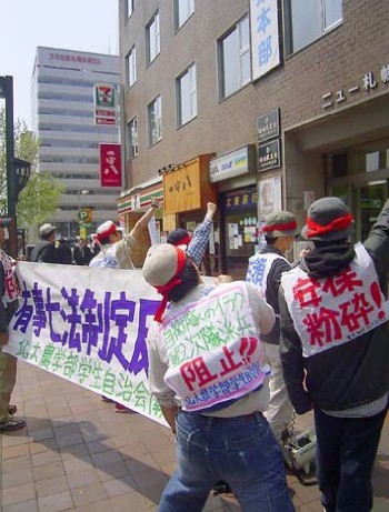 5・20札幌 五月二十日、北大農学部学生自治会を中心とするたたかう北大生たちは、小泉政権による衆議院本会議における有事関連七法案の採決・可決を阻止するために、札幌市内の自民党北海道連合にたいする闘争に決意も固く決起した。 |