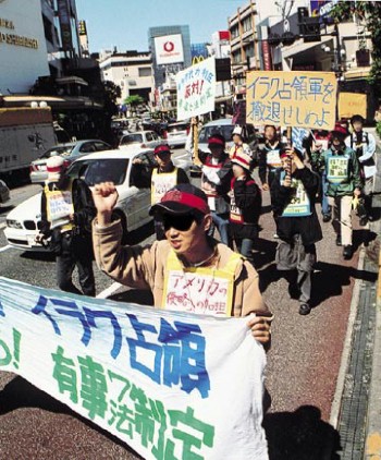 五月二十八日、日比谷野外音楽堂において、「フォーラム平和・人権・環境(平和フォーラム)」などの呼びかけた「有事関連七法案を廃案へ 自衛隊はイラクから撤退を 5・28集会」が二五〇〇名(主催者発表)を結集して開催された。この集会を戦闘的に塗り変えるために、わが革命的・戦闘的労働者は各組合内部でたたかいぬいた。これに連帯してわが同盟の情宣部隊は有事関連法案に賛成した民主党を弾劾してたたかうべきことを呼びかけて奮闘した。 |