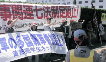 小泉政権が参議院において有事関連七法案・三条約承認の採決を強行しようとしていた六月十四日、首都圏の学生は、国会前闘争に決起した。 |