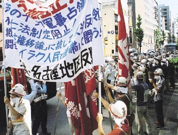 名古屋に占領反対・反安保の声高く 日共の参院選への埋没を弾劾 全学連東海地方共闘会議と名古屋地区反戦の労働者は六月十三日、首都と関西の闘いと固く連帯して、<日本国軍の多国籍軍への参加阻止! 米英軍のイラク軍事占領反対! 有事七法制定阻止!憲法改悪反対!>を掲げ労学統一行動に断固としてたちあがった。 |