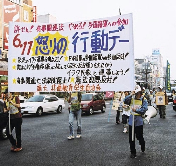 「許さん! 有事関連法」 鹿大生のデモに共感拡がる 鹿児島大学のたたかう学生は、六月十一日を「許さん! 有事関連法 やめろ! 自衛隊の多国籍軍参加 怒りの行動デー」として設定し、終日、大衆的な闘いをつくりだした。 |