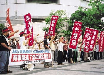 沖縄の労学が有事七法の制定を弾劾 6・15 六月十五日、那覇市県庁前の「県民広場」で、「有事関連法糾弾! 戦争への道を許さない緊急集会」が沖縄平和運動センターの主催のもとに開催された。琉大・沖国大のたたかう学生たちも、「有事関連七法の制定弾劾! 日本国軍の多国籍軍への参加阻止!」と赤地に白抜きの文字で大書きした横幕を広げ、結集してくる労働者・市民に元気よく檄をとばした。 |