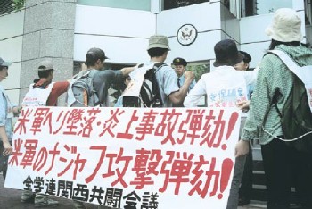 八月十三日に発生した米海兵隊ヘリの沖国大本部棟への墜落・炎上事故を弾劾する闘いに、全学連の学生たちは全国各地で決起した。 この米軍ヘリは、劣化ウラン弾を搭載して、イラクに出撃するための訓練をおこなっていたにちがいないのだ。おりしもイラクのナジャフにおいては、米軍の全面攻撃にたいして、サドル派マフディ軍が決死的闘いを展開していた。学生たちは、反米反占領闘争をたたかうイラク人民と連帯してたたかいぬいた。 |